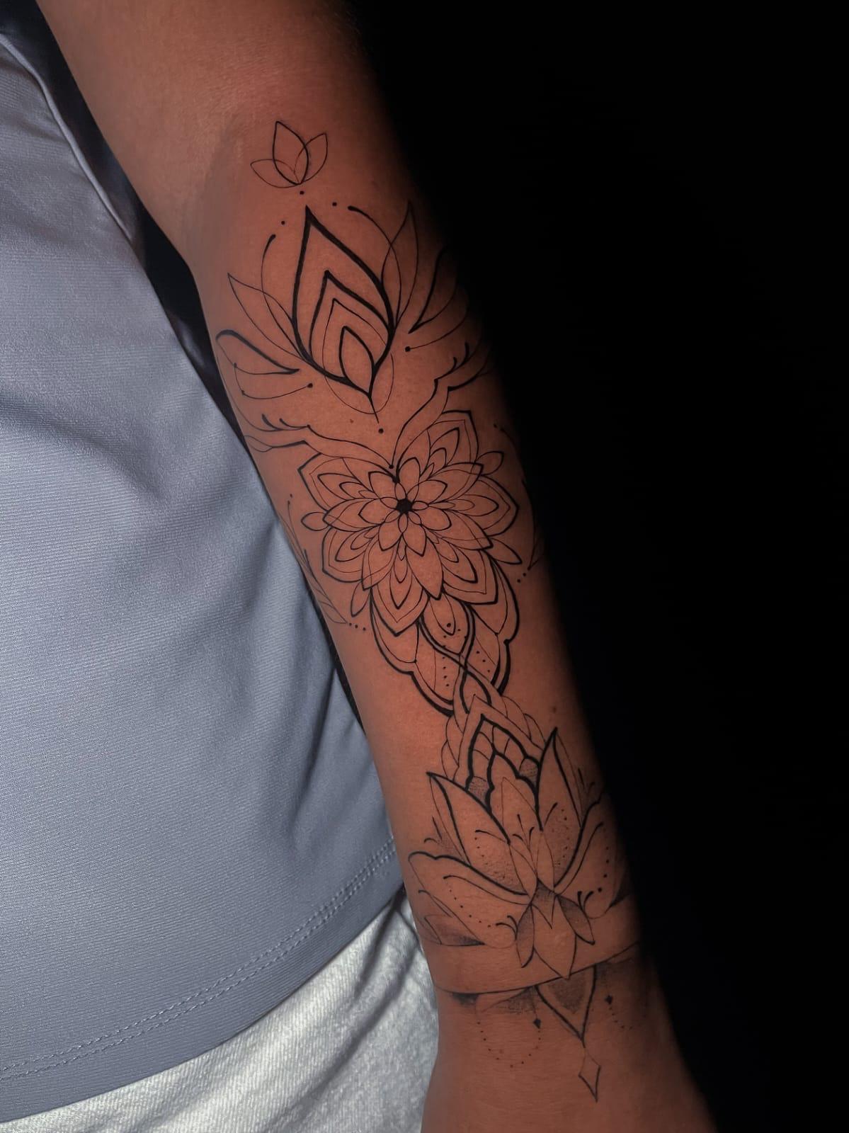 Stipjes, strakke lijnen en vrije vormen, dat zijn typische elementen van dotwork, geometrische tattoos en mandala’s.